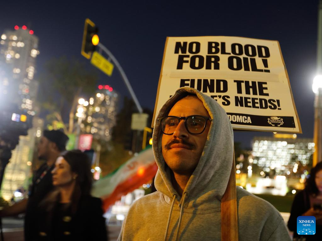 People protest against U.S. military attack on Iran in Los Angeles, the United States, on March 2, 2026. (Xinhua)