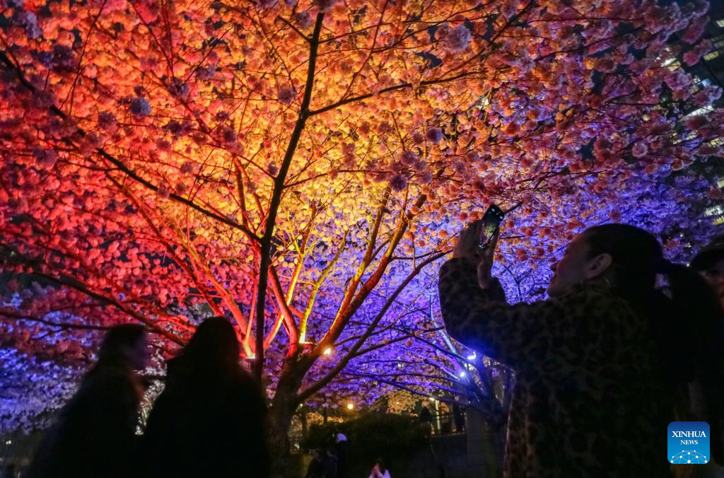People view illuminated cherry blossom trees during the Blossoms After Dark event at David Lam Park in Vancouver, British Columbia, Canada, on March 27, 2026. The two-night free outdoor event features illuminated cherry blossoms, performances, food vendors and interactive activities. (Photo by Liang Sen/Xinhua)