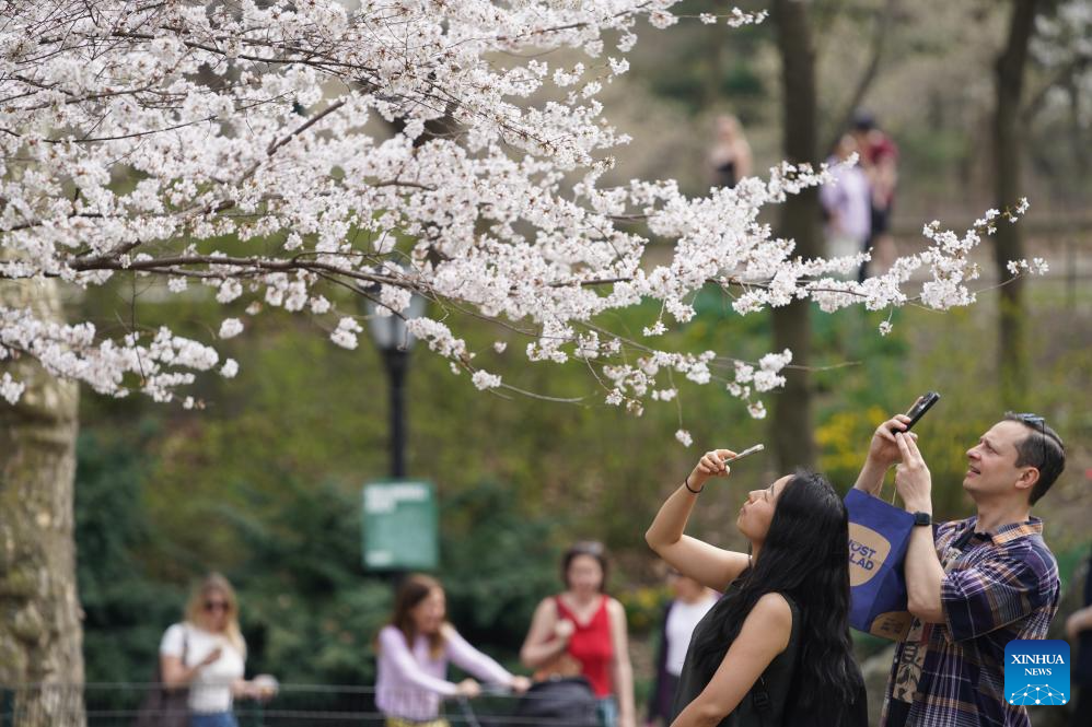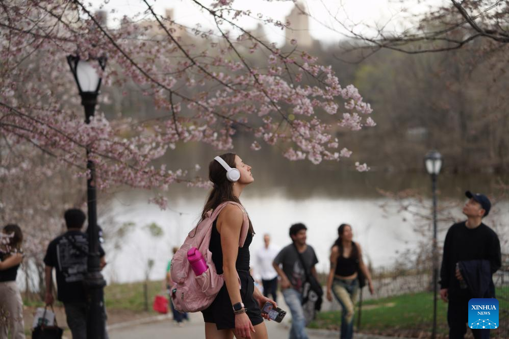 People watch cherry blossoms at the Central Park in New York, the United States, on April 1, 2026. (Xinhua/Zhang Fengguo)