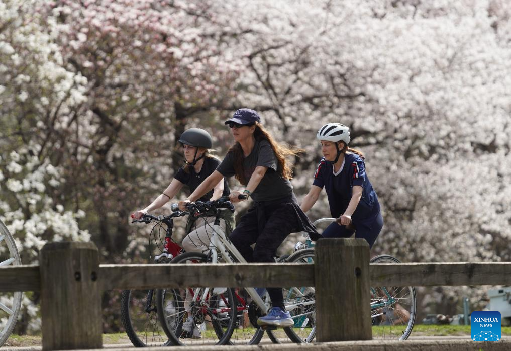 People ride bicycles at the Central Park in New York, the United States, on April 1, 2026. (Xinhua/Zhang Fengguo)