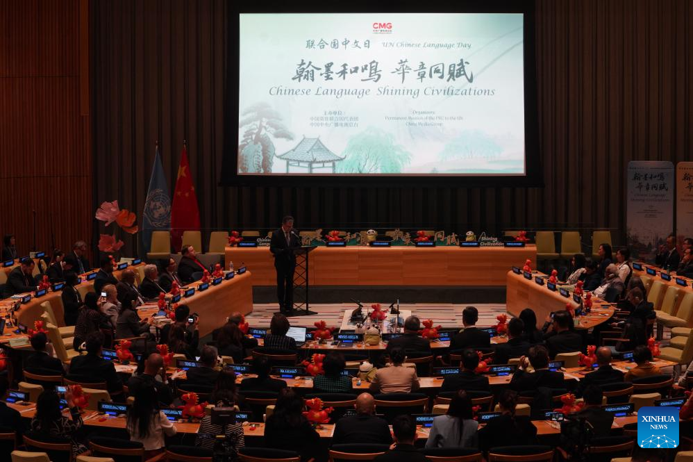 People attend a celebration marking the UN Chinese Language Day at the UN headquarters in New York, on April 13, 2026. A celebration titled Chinese Language Shining Civilizations was held at the UN headquarters in New York to mark the UN Chinese Language Day on Monday. (Xinhua/Zhang Fengguo)