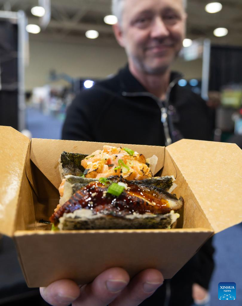 A man displays sushi tacos at the T.O. Food & Drink Fest in Toronto, Canada, April 17, 2026.
