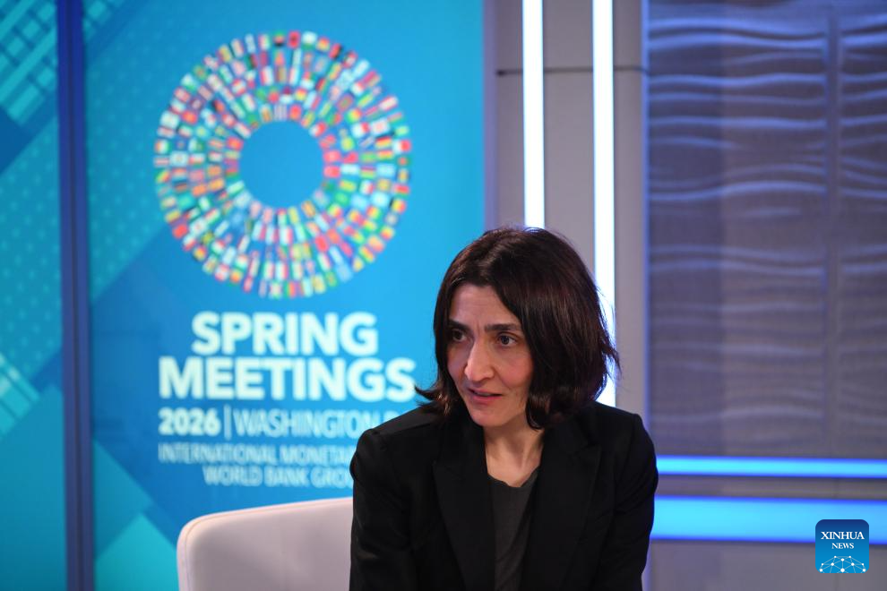 Deniz Igan, chief of the International Monetary Fund (IMF) Research Department's World Economic Studies Division, receives an interview with Xinhua during the 2026 Spring Meetings of the IMF and the World Bank Group in Washington, D.C., the United States, April 14, 2026. (Xinhua/Li Rui)
