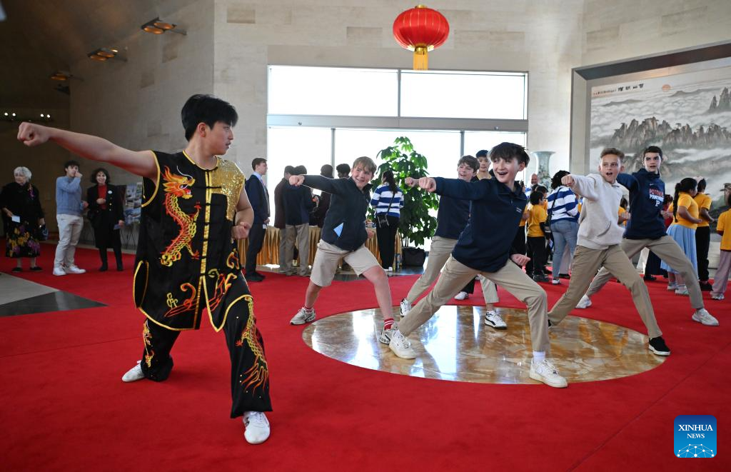 An actor from China guides American students to perform Chinese martial arts in celebration of the International Chinese Language Day at the Chinese Embassy in Washington, D.C., the United States, April 21, 2026. (Xinhua/Li Rui)