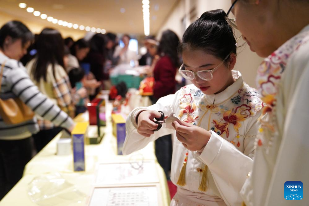 A girl learns to make a paper cutting work during a cultural event marking the seventh United Nations Chinese Language Day at the UN headquarters in New York, on April 20, 2026. (Xinhua/Zhang Fengguo)