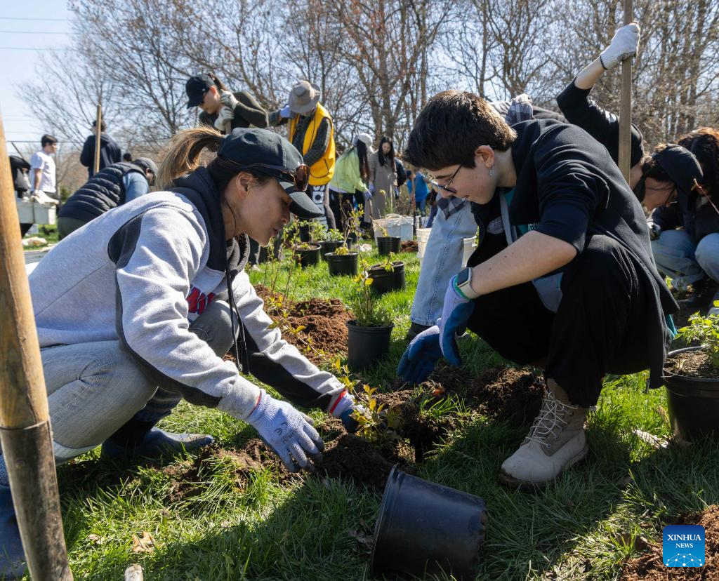 People participate in a tree planting event at a park in Toronto, Canada, April 22, 2026. The City of Toronto held a tree planting event here on Wednesday to mark Earth Day, drawing more than 160 participants. (Photo by Zou Zheng/Xinhua)