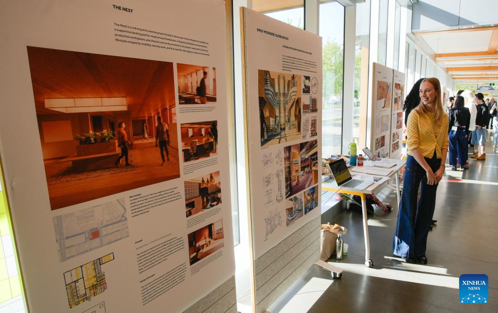 Interior design projects are displayed during a graduation show of the Wilson School of Design at Kwantlen Polytechnic University (KPU) in Richmond, British Columbia, Canada, April 23, 2026. The trade-show style event showcases creative works by graduating students, featuring projects in fashion, graphic, interior and product designing. (Photo by Liang Sen/Xinhua)