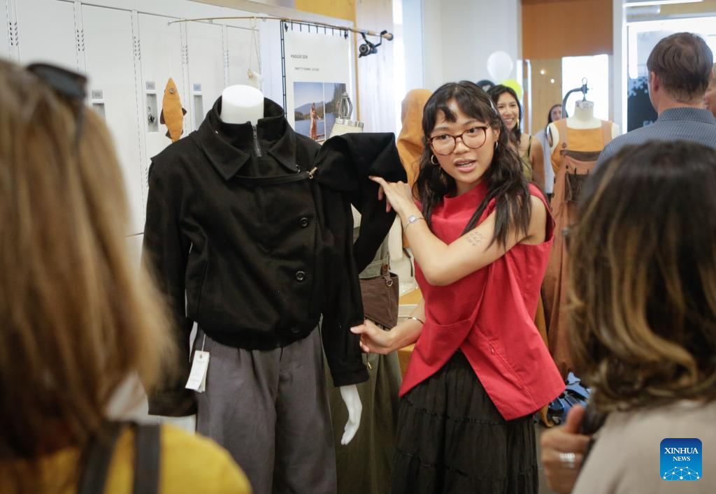 A student explains her fashion design to visitors during a graduation show of the Wilson School of Design at Kwantlen Polytechnic University (KPU) in Richmond, British Columbia, Canada, April 23, 2026. The trade-show style event showcases creative works by graduating students, featuring projects in fashion, graphic, interior and product designing. (Photo by Liang Sen/Xinhua)