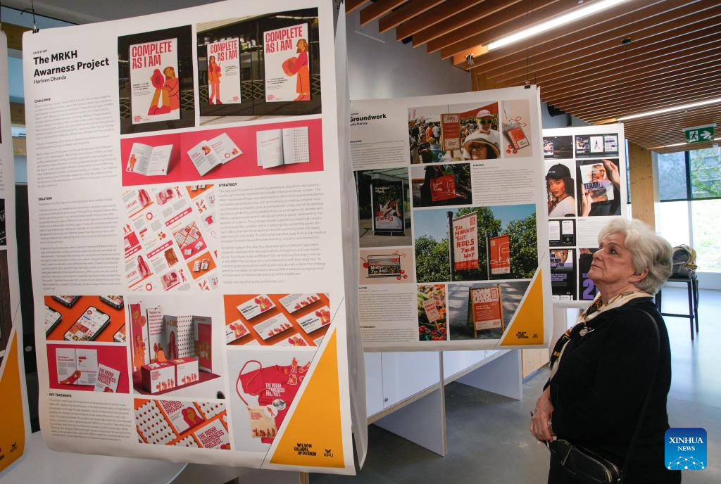A visitor views design projects displayed during a graduation show of the Wilson School of Design at Kwantlen Polytechnic University (KPU) in Richmond, British Columbia, Canada, April 23, 2026. The trade-show style event showcases creative works by graduating students, featuring projects in fashion, graphic, interior and product designing. (Photo by Liang Sen/Xinhua)