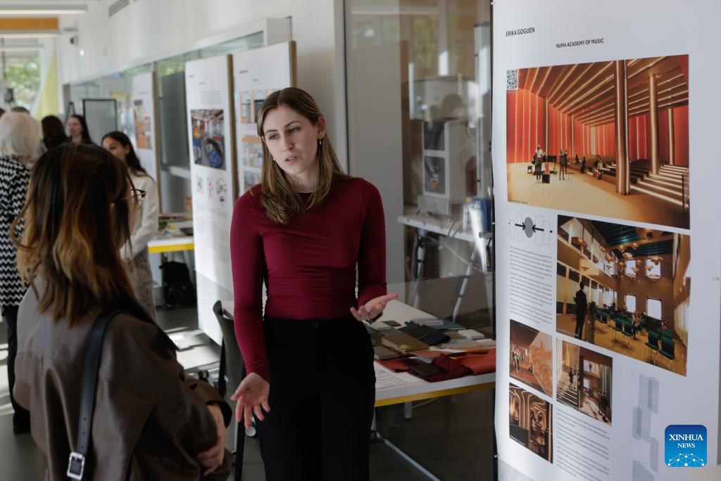 A student explains her interior design project to a visitor during a graduation show of the Wilson School of Design at Kwantlen Polytechnic University (KPU) in Richmond, British Columbia, Canada, April 23, 2026. The trade-show style event showcases creative works by graduating students, featuring projects in fashion, graphic, interior and product designing. (Photo by Liang Sen/Xinhua)