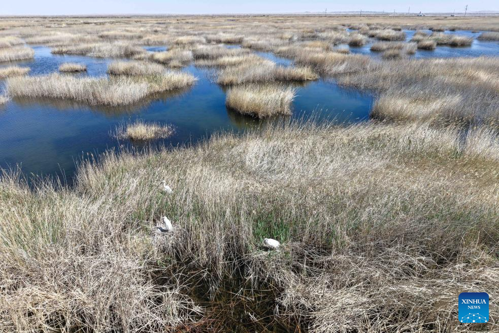 A drone photo taken on April 24, 2026 shows great egrets perching in the reeds in the Qingtu Lake in Minqin County, northwest China's Gansu Province. As the temperature rises, various birds inhabiting in the Qingtu Lake have gradually entered the breeding season. (Xinhua/Lang Bingbing)