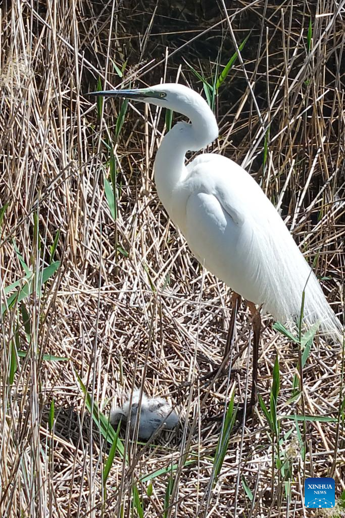 A drone photo taken on April 24, 2026 shows a great egret and its chicks perching in the reeds in the Qingtu Lake in Minqin County, northwest China's Gansu Province. As the temperature rises, various birds inhabiting in the Qingtu Lake have gradually entered the breeding season. (Xinhua/Lang Bingbing)