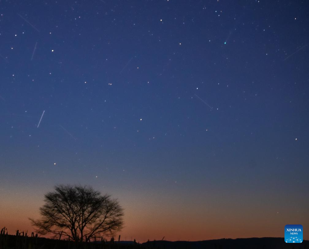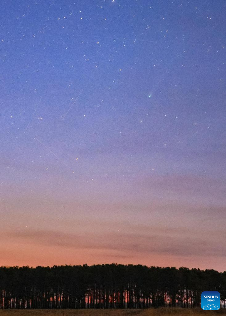 This photo taken on April 14, 2026 shows the comet C/2025 R3 in the sky over Huachuan County of Jiamusi City, northeast China's Heilongjiang Province. (Photo by Zhu Zongqiang/Xinhua)