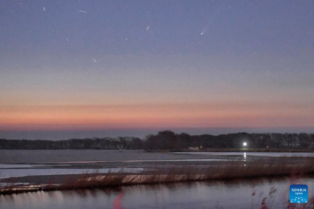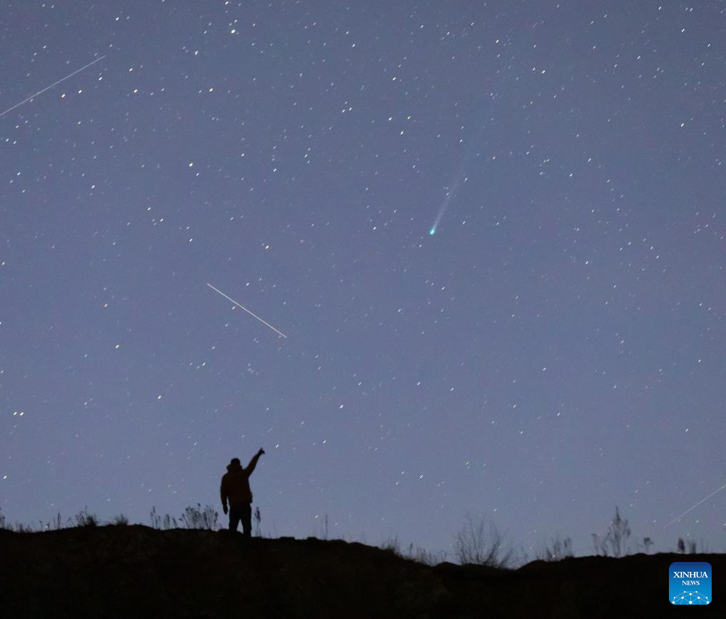 This photo taken on April 18, 2026 shows the comet C/2025 R3 in the sky over Qiqihar City, northeast China's Heilongjiang Province. (Photo by Wang Yonggang/Xinhua)