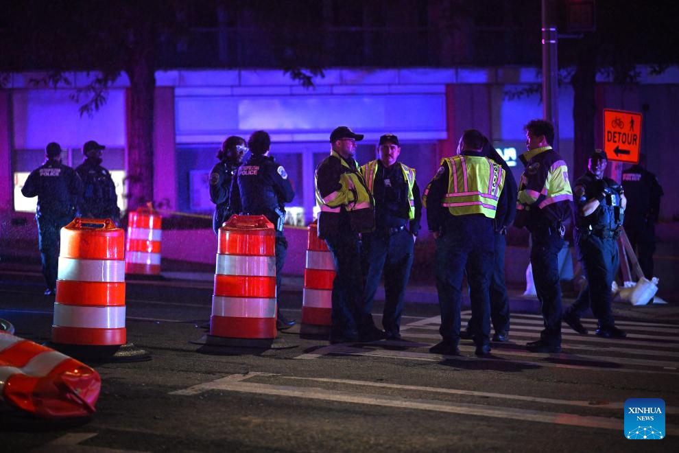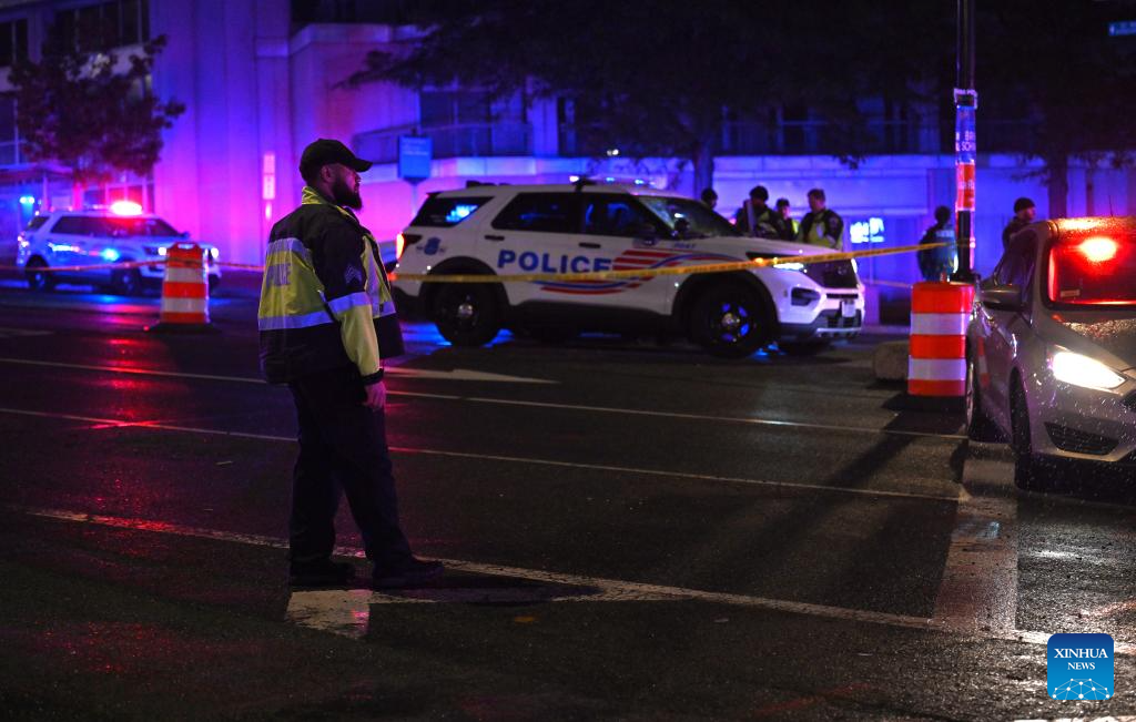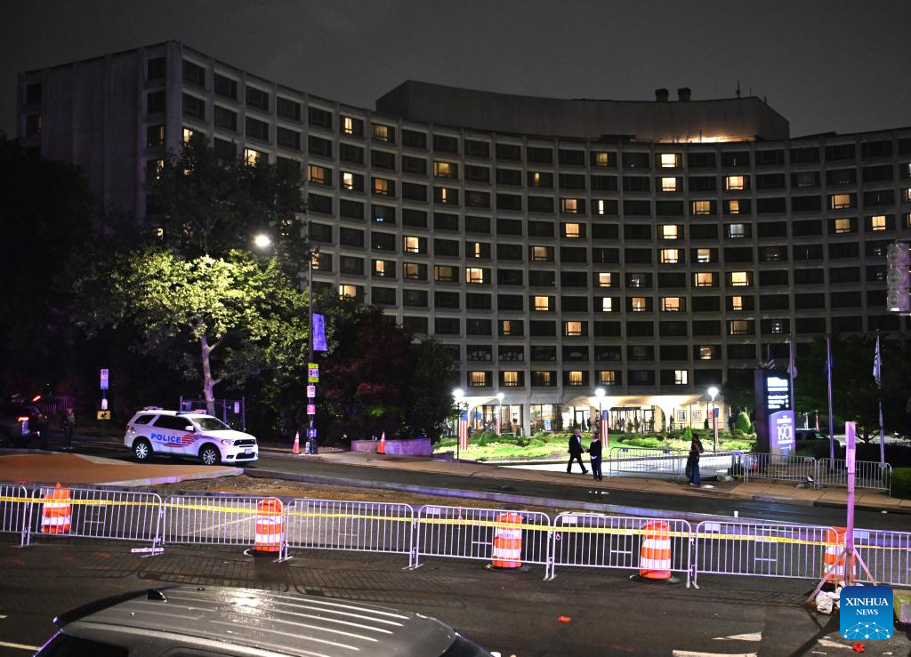 Police officers stand guard near the Washington Hilton Hotel, where the White House Correspondents' Dinner was held, in Washington, D.C., the United States, April 25, 2026. In a joint press conference, Washington, D.C. Mayor Muriel Bowser said all guests at the dinner were safe, while U.S. Attorney for D.C. Jeanine Pirro said the suspect now faces charges including using a firearm during a crime of violence and assault on a federal officer with a dangerous weapon.