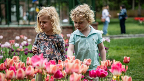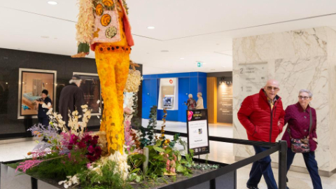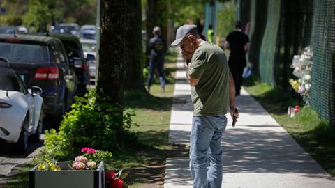 People look at Christmas-themed lights and decorations in Mississauga, Canada