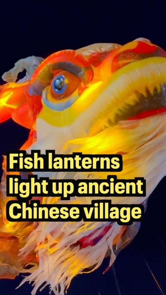 Giant surreal fish lantern "swims" through ancient Chinese village
